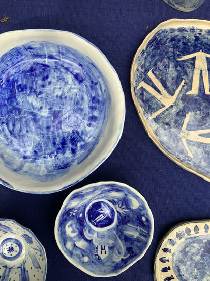 Céramiques en argile blanche réalisées en modelage. Dessin fait à l'engobe ou à la poudre d'oxyde de cobalt